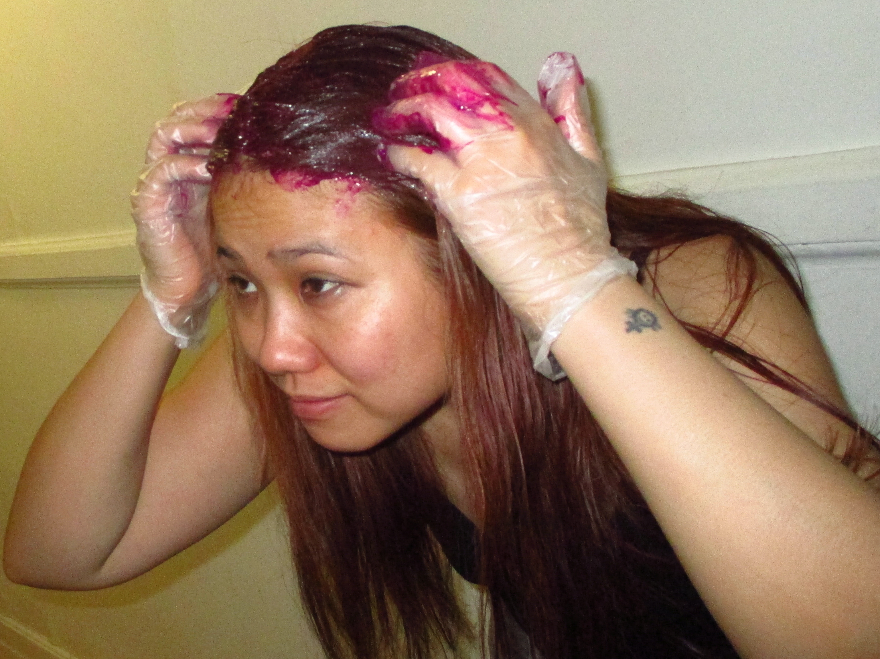 After shampooing the toner and peroxide out, I skip conditioning and lightly towel dry my hair.  It is important to skip conditioning, because most vibrant colours don’t use peroxide to penetrate the hair, but instead use conditioners to.  Leaving your hair clean and thirsty for conditioning makes vibrant colouring stick better.  The brand that I use is Adore.  I’ve been using a bright pinky red the last few times, so this time I changed it up with a redish purple colour called Violet Gem.  I mix the dye with conditioner to get the right consistency and to stretch it out.  Then I apply it all over my hair.  Since there is no peroxide in the colouring, it actually feels nice going on.  And it smells pretty good too!