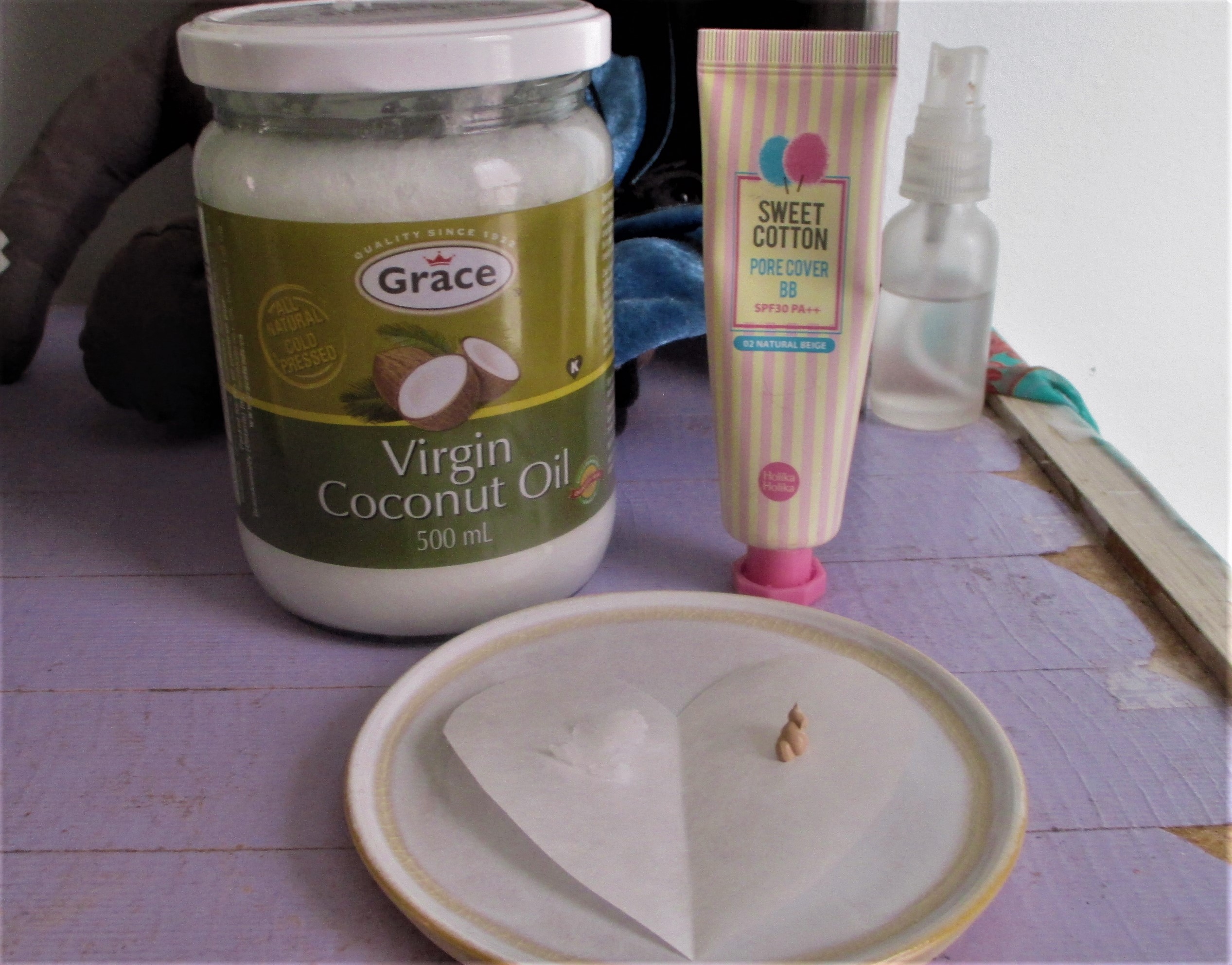 Find a good heavy coverage foundation/bb cream. Place a dab of it in your palm. Then add two to three generous drops of coconut oil (coconut oil is a solid in cooler temperatures, but will melt at body temp into a silky oil, easily mixable into make-up) Mix the coconut oil and foundation/bb well and evenly in the palm of your hand and with your finger and apply to your face, smoothing and massaging it in as you go.  Coconut oil not only stretches the foundation/bb, but also extends the spreading time before it sets on the face, making it a more even application.  On days you want more coverage, use less coconut oil and more foundation/bb.  For just problem areas (discoloration, darkness), treat with an application of full strength foundation/bb on top of the first sheer layer. Powder to set.  Finish with a setting spray such as my DIY Rosewater Glycerin Spray.
