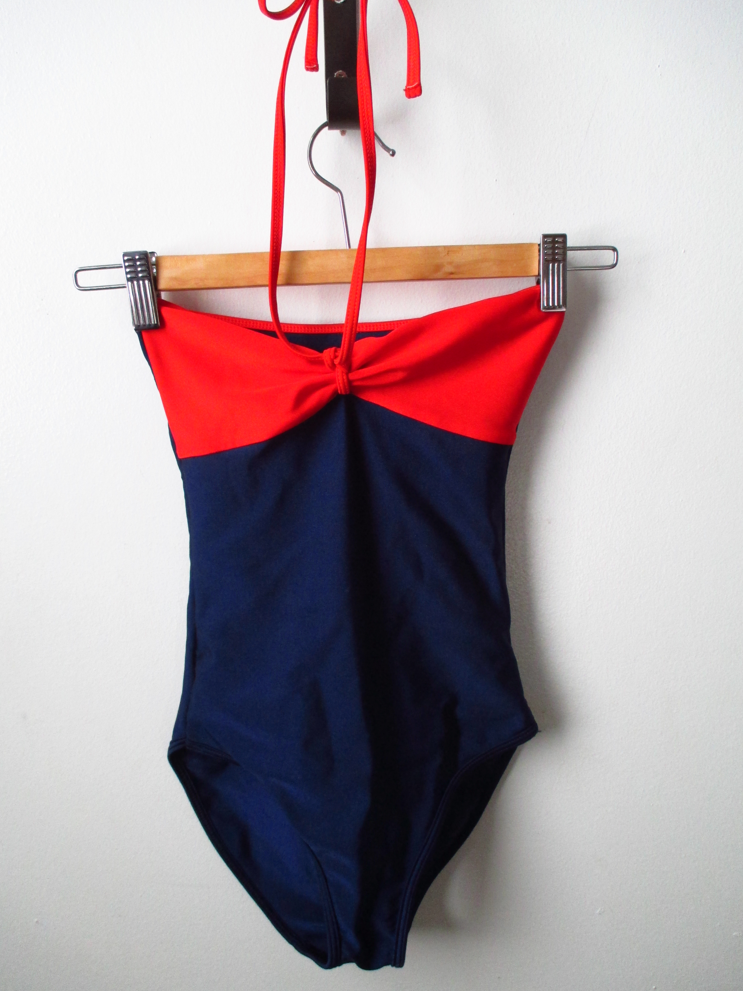 Such fun colours! Tangerine red, and navy blue, haltered and just super fitted and cute. I really lucked out on this bathing suit find...