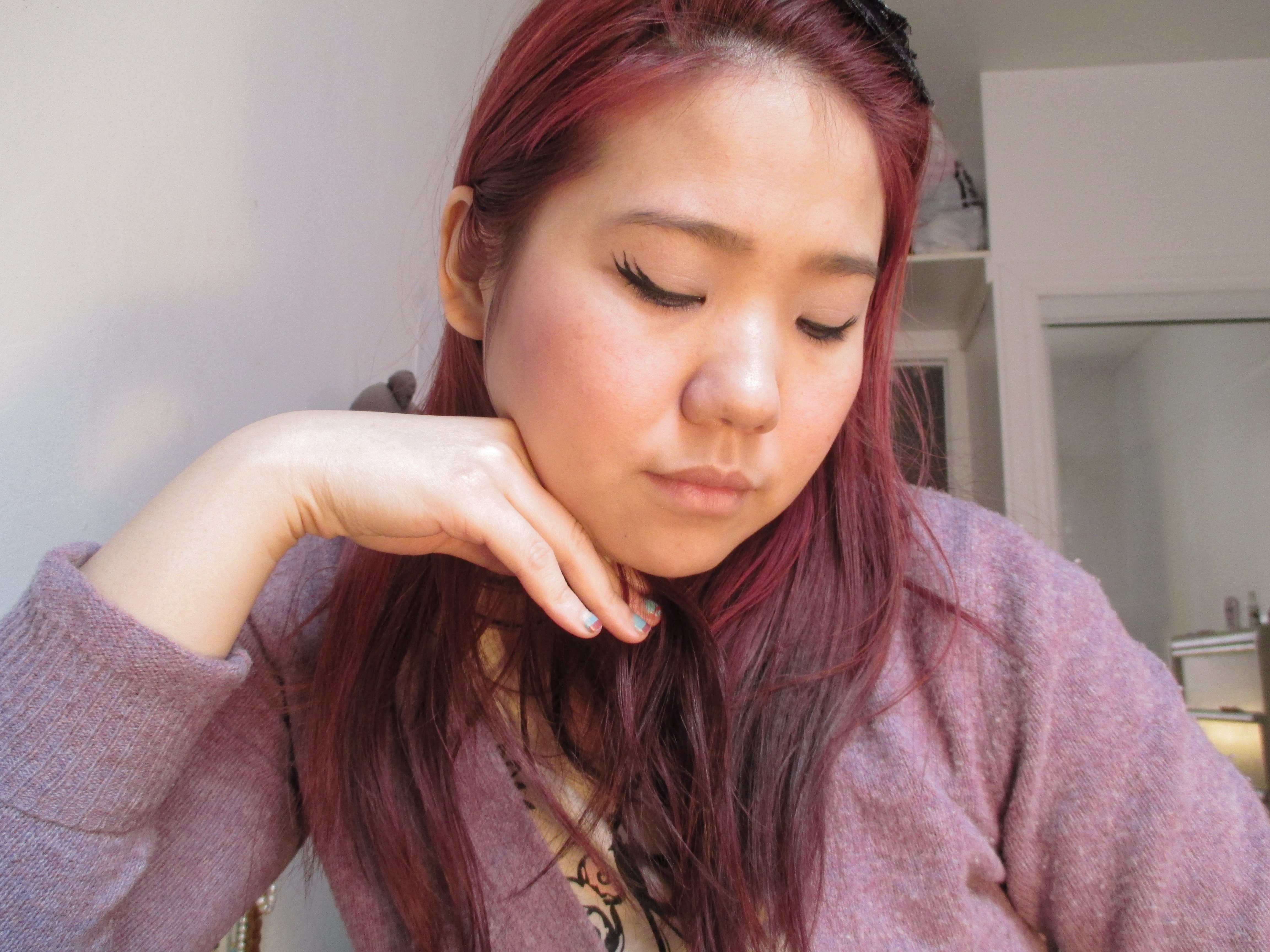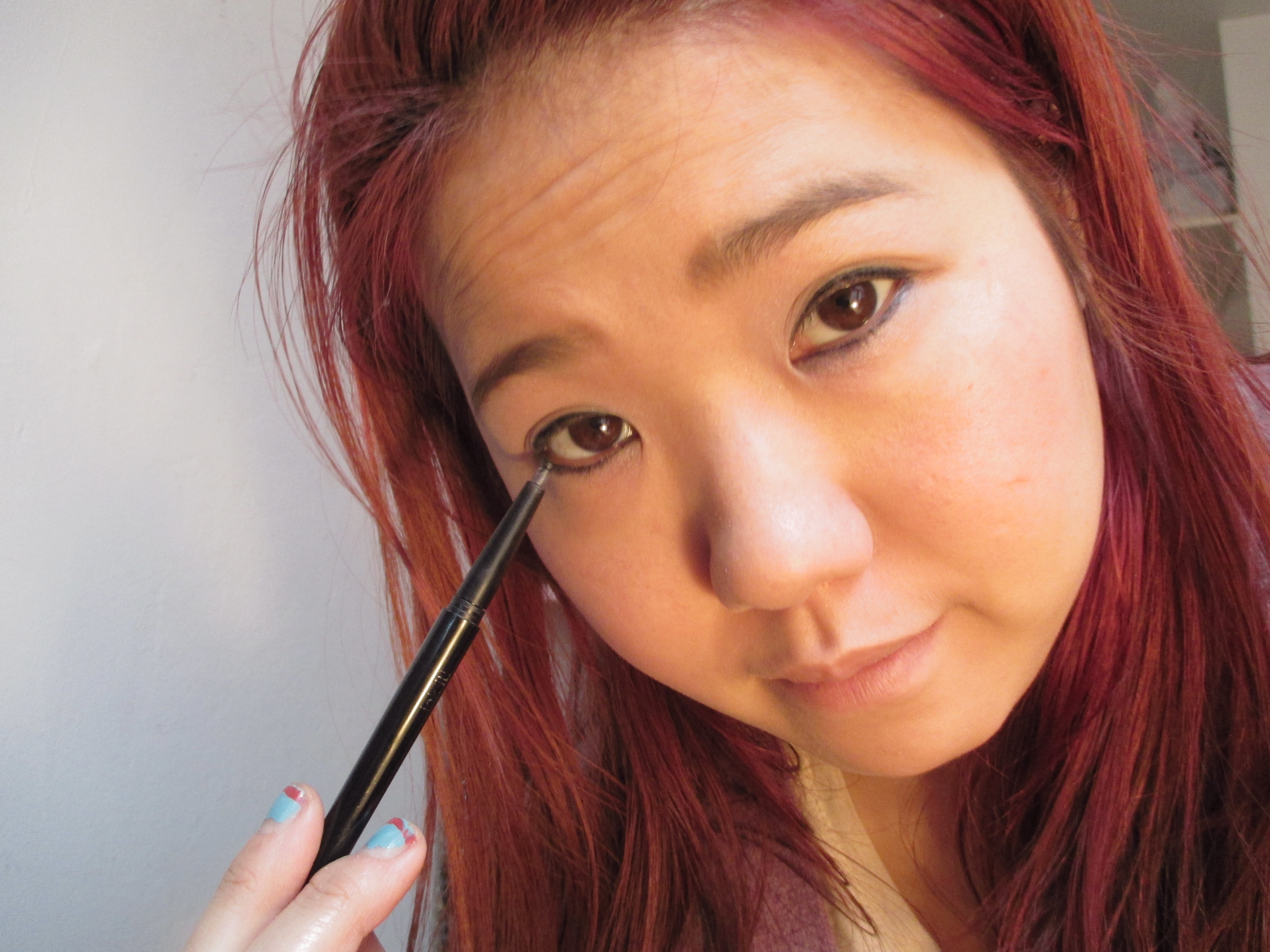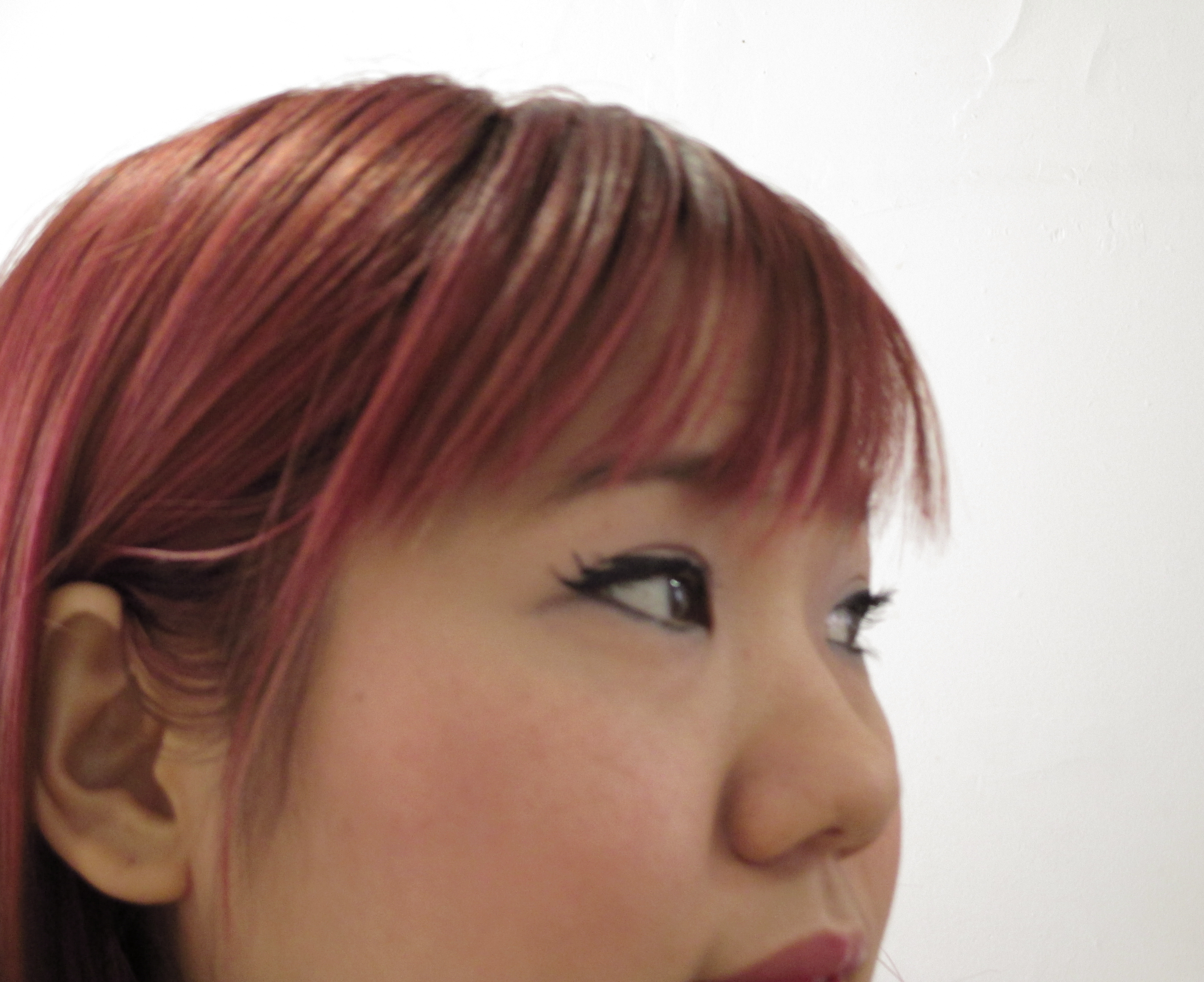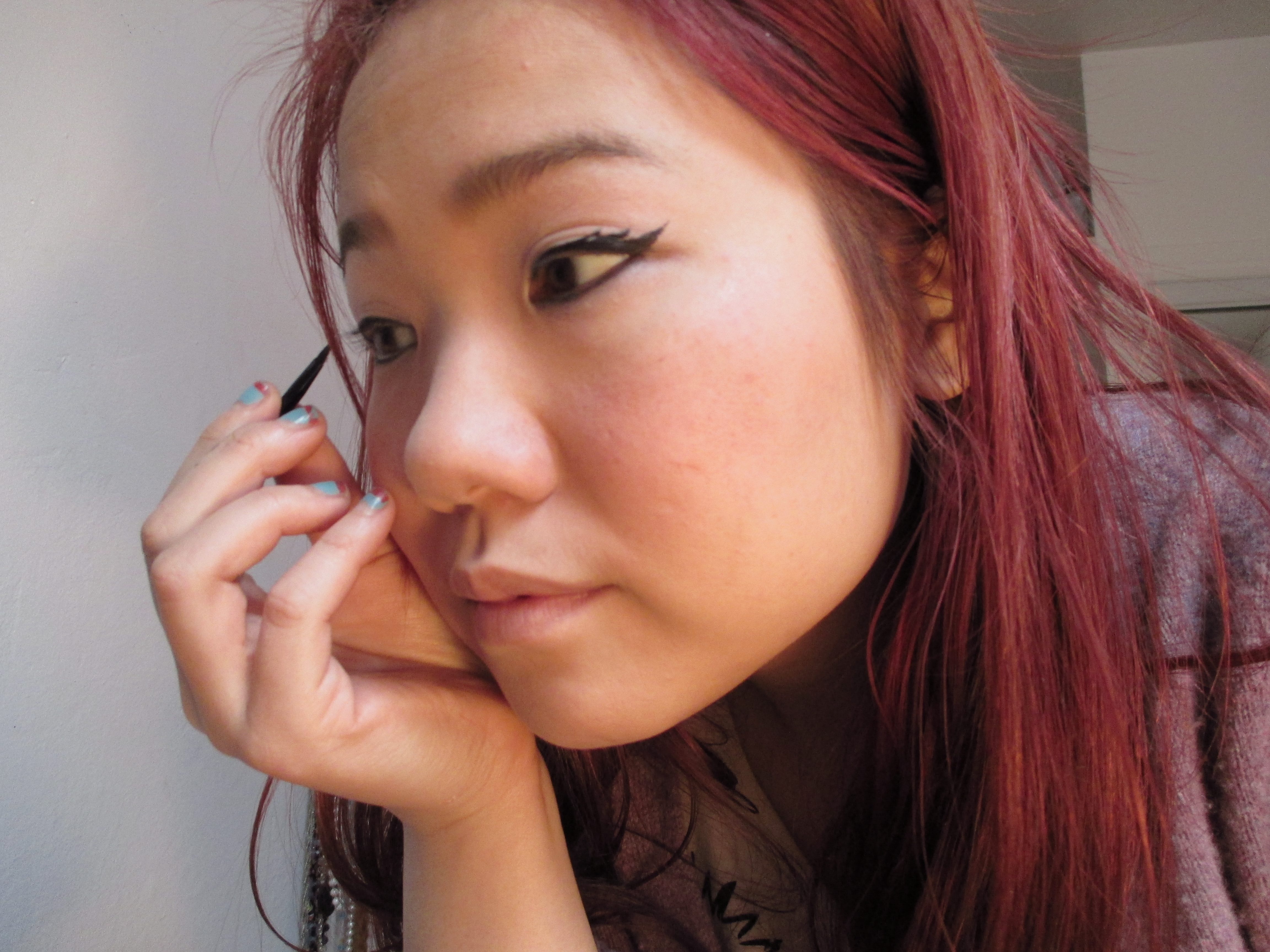 Similar to the famous “cat eye” make-up of an angled slanty-eyed look with black liquid liner on the top eyelid, I decided to get a bit more playful and curly with my “mouse eye” look. Here’s how to do it: