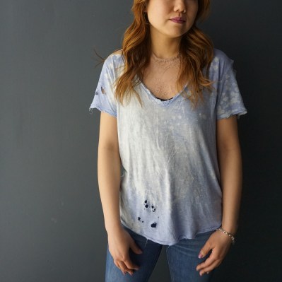 So this t-shirt reminded me of a shirt that an artist/painter might wear in her studio. Loose, flowy, and distressed beyond recognition. But as a new tee, this shirt wasn’t going to tell that story. So, after sandpapering holes, cutting holes and just destroying the colour of the shirt with bleach, I got a more raggedy worn-in look. Now the shirt tells the story that I might be a struggling artist and this shirt has been destroyed since I use it for art making and everything else the imagination will allow. Kind of cool…