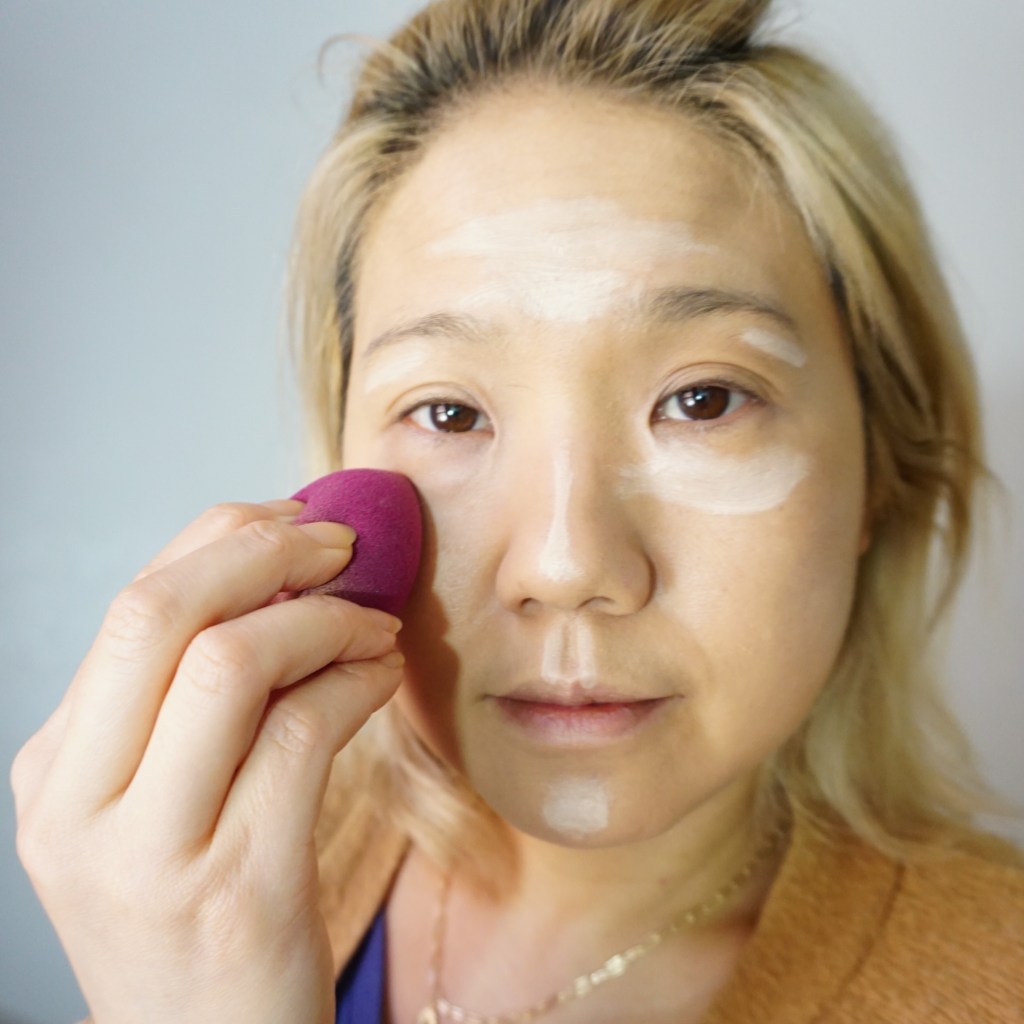 - Apply a good foundation on lightly moisturized face. Medium to heavy coverage is best for photos. Then apply and highlighting concealer in certain spots: forehead triangle, under eye bags, nose bridge, chin etc…then blend with a beauty sponge, powder to finish and set.