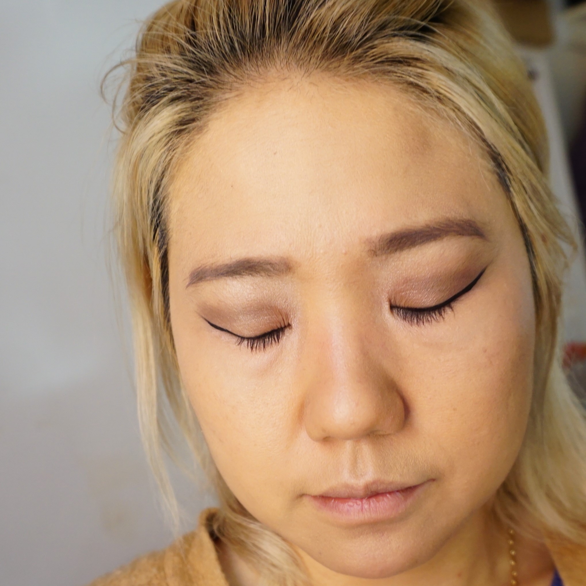 - Next, define the eyebrows with a pencil or powder or gel. Put on the eyeshadow base. I like to use a slight shimmer on my bottom lids for more cute glow. A skin coloured shadow for the top lids work great as a base. Next add a shimmery taupe shade all over the lid. Take a dark tan colour shadow for the crease and outer edges of the lid. blend with a fluffy eyeshadow brush.
