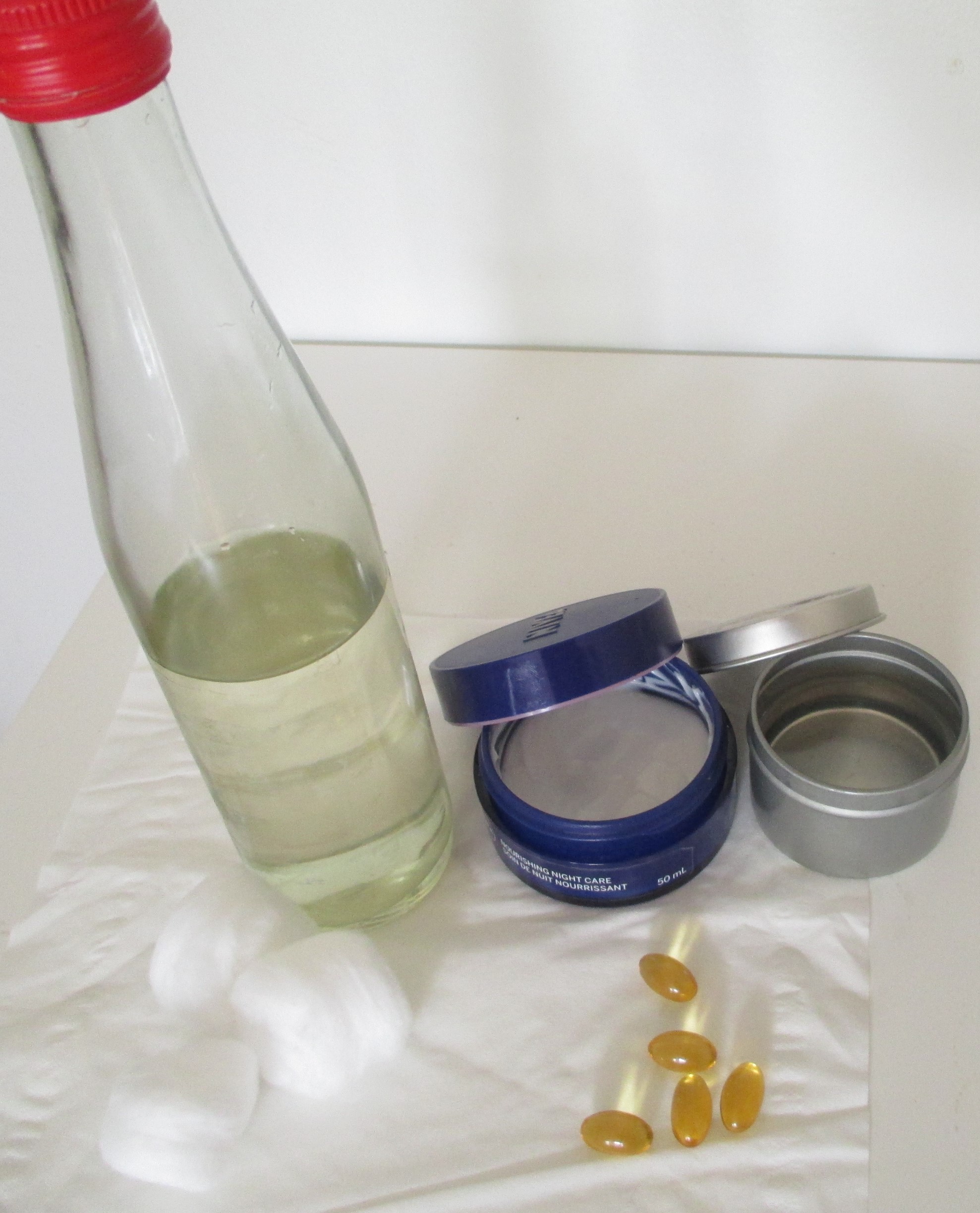 Some of my skin care products that I have a regular relationship with. Toner and cotton balls, vitamin E capsules, heavy night cream, and coconut oil. Lots of work, but it is worth it! Kinda of like a boyfriend. 🙂